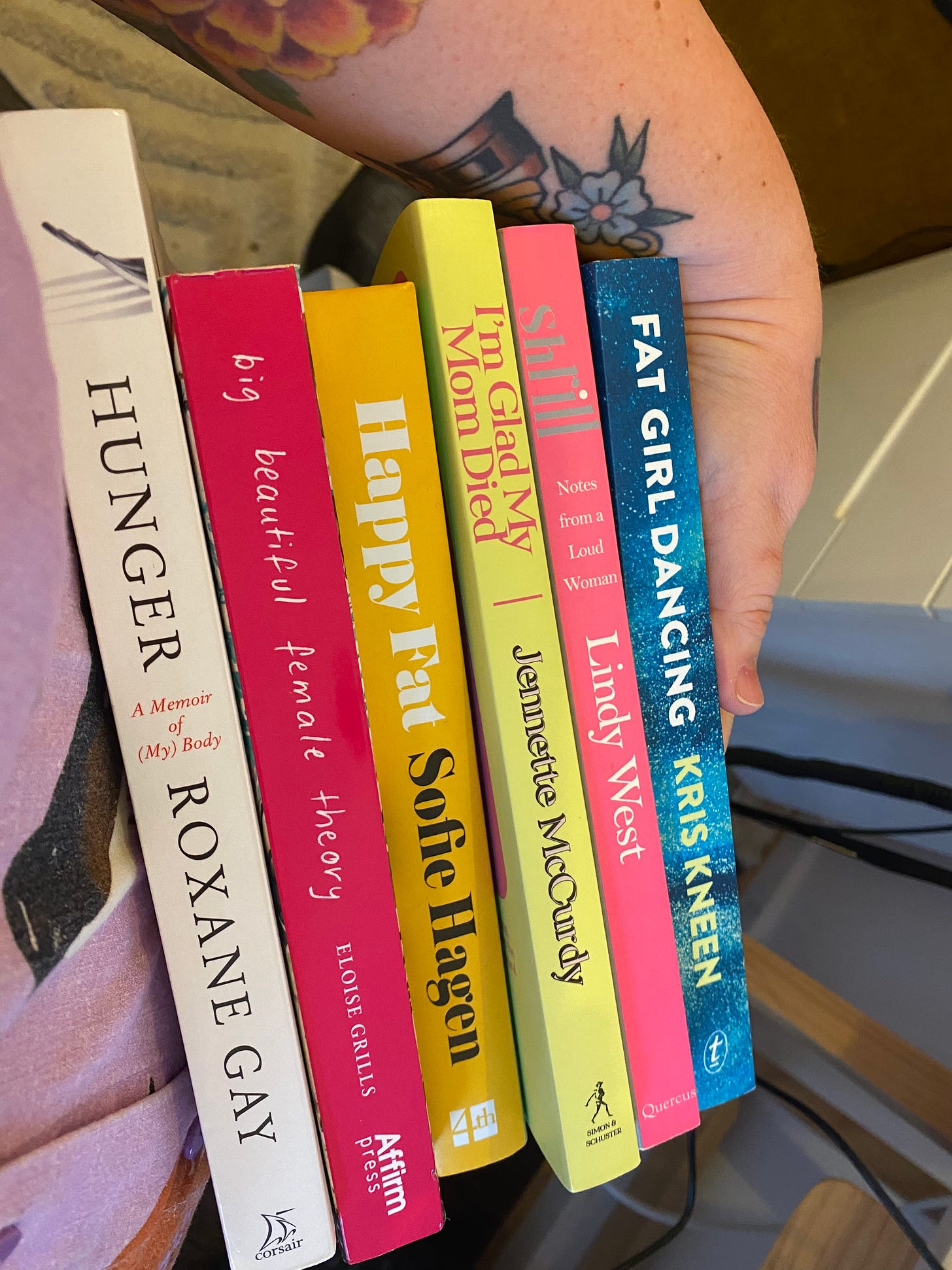 Reading list for disordered eating recovery: Hunger by Roxane Gay, big beautiful female theory by Eloise Grills, Happy Fat by Sofie Hagen, I’m Glad My Mom Died by Jennette McCurdy, Shrill - Notes from a Loud Woman by Lindy West and Fat Girl Dancing by Kris Kneen.