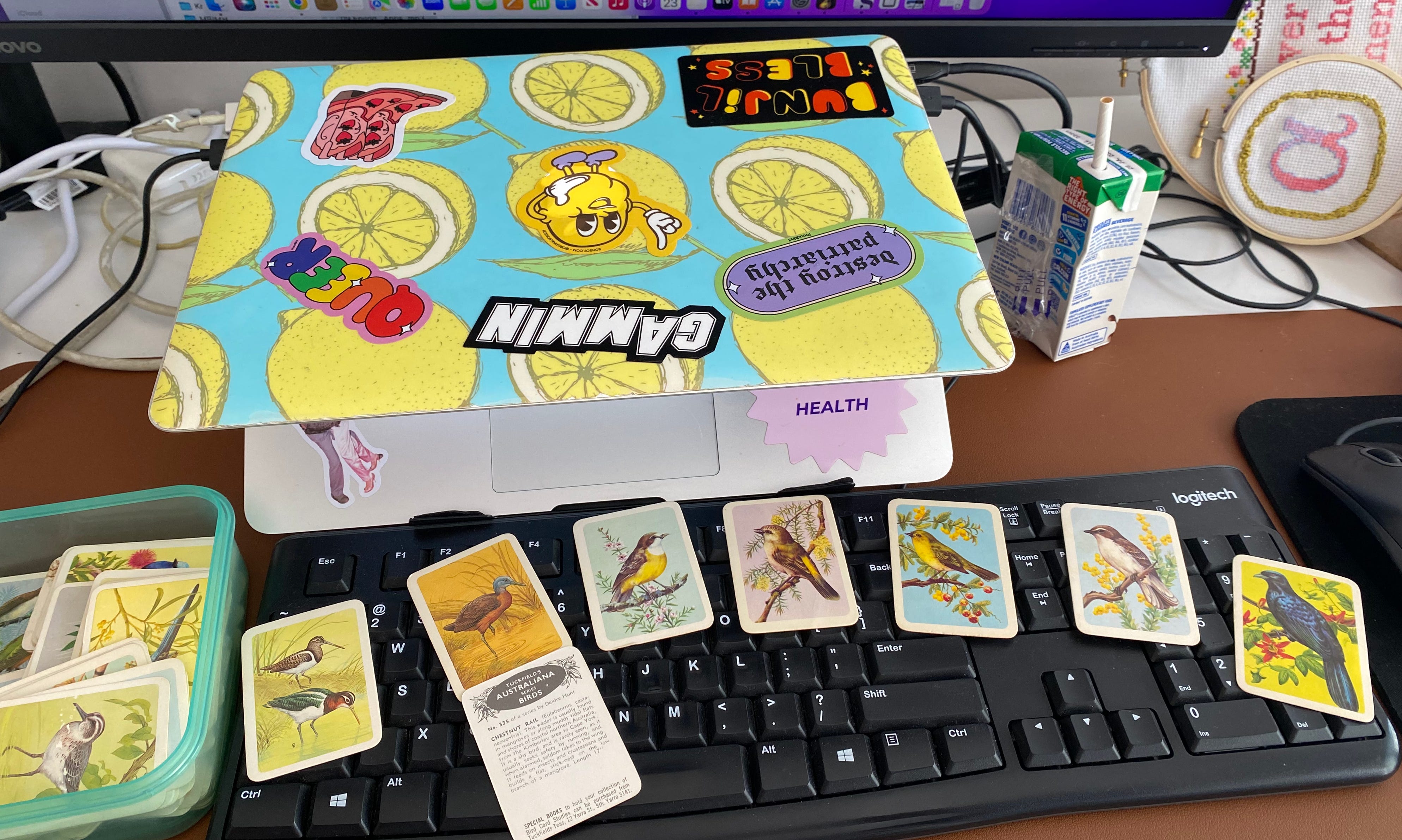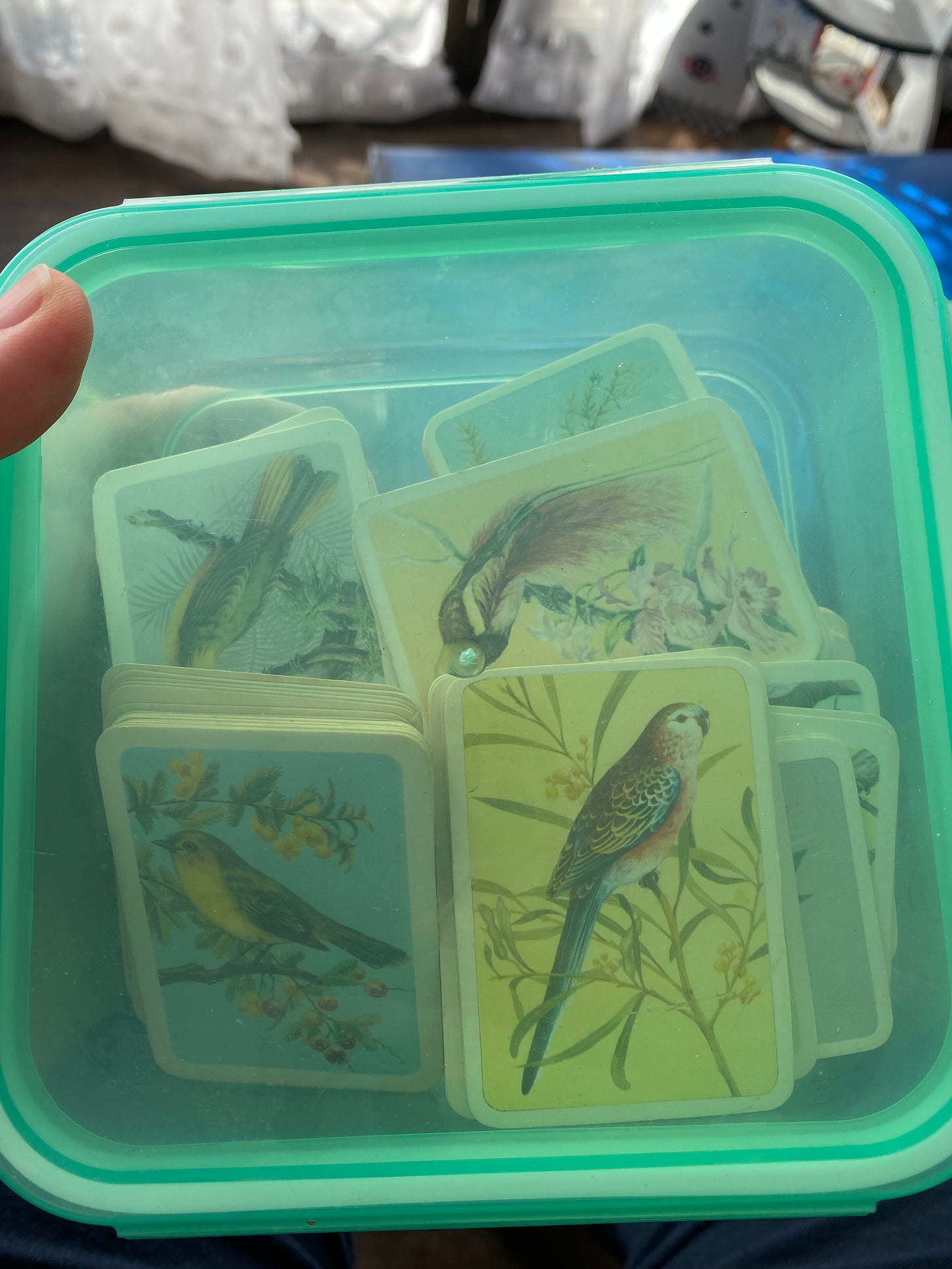 I have this green Tupperware full of bird cards. Originally collected from tins of tea by my mother’s mother, given to me when I was a child and held safely by mum until a few years ago. She came to see the house we moved to a bit out of town, the kids showed her their bedrooms and she pushed them both on the swings in the backyard.