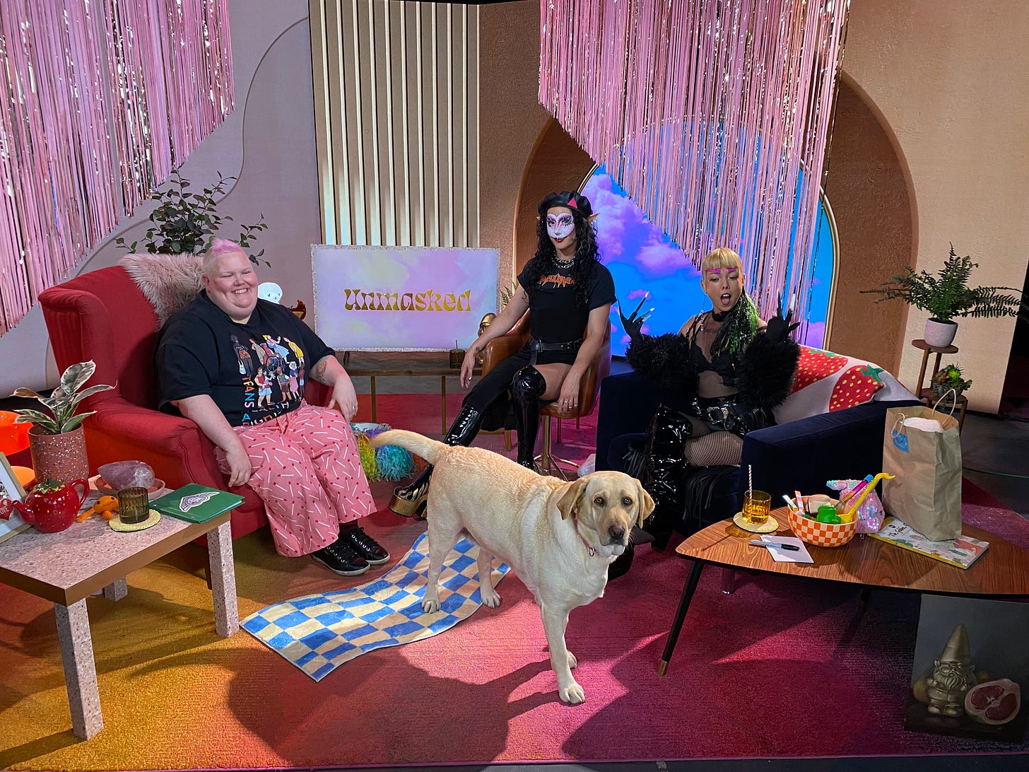 Visual description: The set of Unmasked with me, Cool and performing artists Themme Fatale and Eden Swan