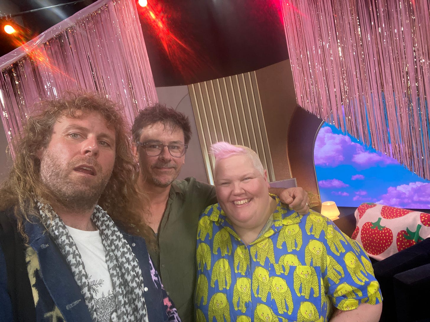 Last week all the work and planning came to fruition and we filmed six episodes over two days. I took eight outfits (just in case I spilled something on one and another one didn’t work) ironed by Mrs Peach so I would look nice for the internet telly (thank you Mrs Peach) and Cool came along too because she generally goes where I go. I brought some things from home to add to the magnificent set created by Bec Petraitis and sat under giant lights in a massive studio while having the deepest and most intensely enlightening conversations of my entire life. Not that it’s a competition, but it felt like a culmination. The set looked like the inside of my brain. Pink and sparkly and lots going on, many textures, comfy chairs, dog hair and me blinking madly in the eye of the storm.