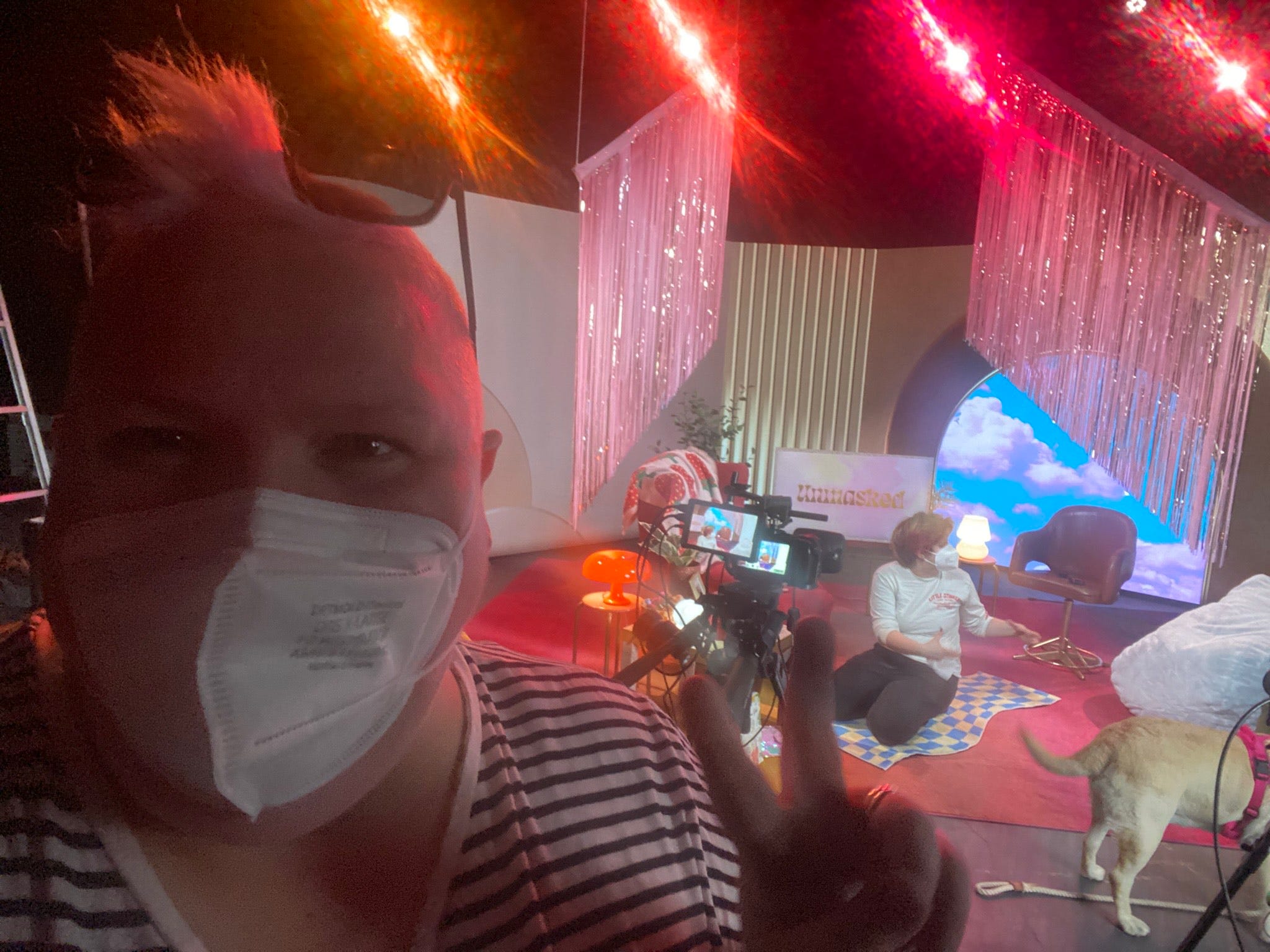 Visual description: a selfie of JP wearing a respirator, in the background Bec (also wearing a respirator) is putting the set for Unmasked together. Cool the golden labrador is also in the shot (just her butt).