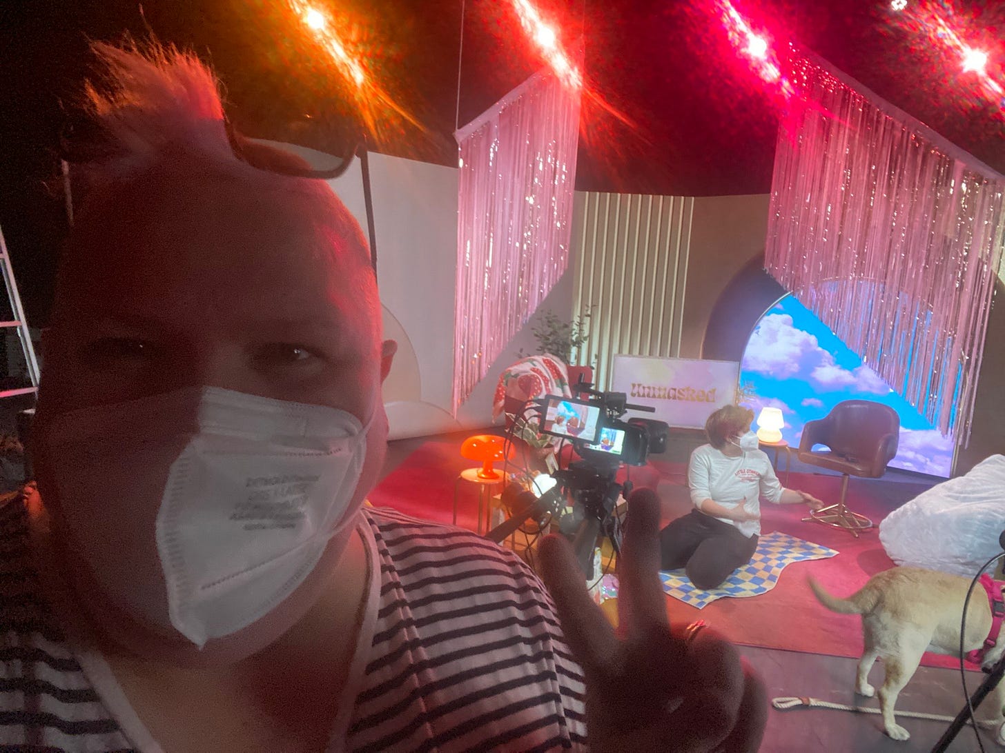 We were a Covid Safe Set, with the minimum number of people, RAT testing prior to entry for every person who came into the space, and masks on unless eating or on camera. I had mine off a bit to not have lines on my face, but everyone else had theirs on. Imagine being treated with so much respect that this is built into your work day, that people have heard your access requirements about avoiding another post viral illness, and put protocols in place that protect everyone?